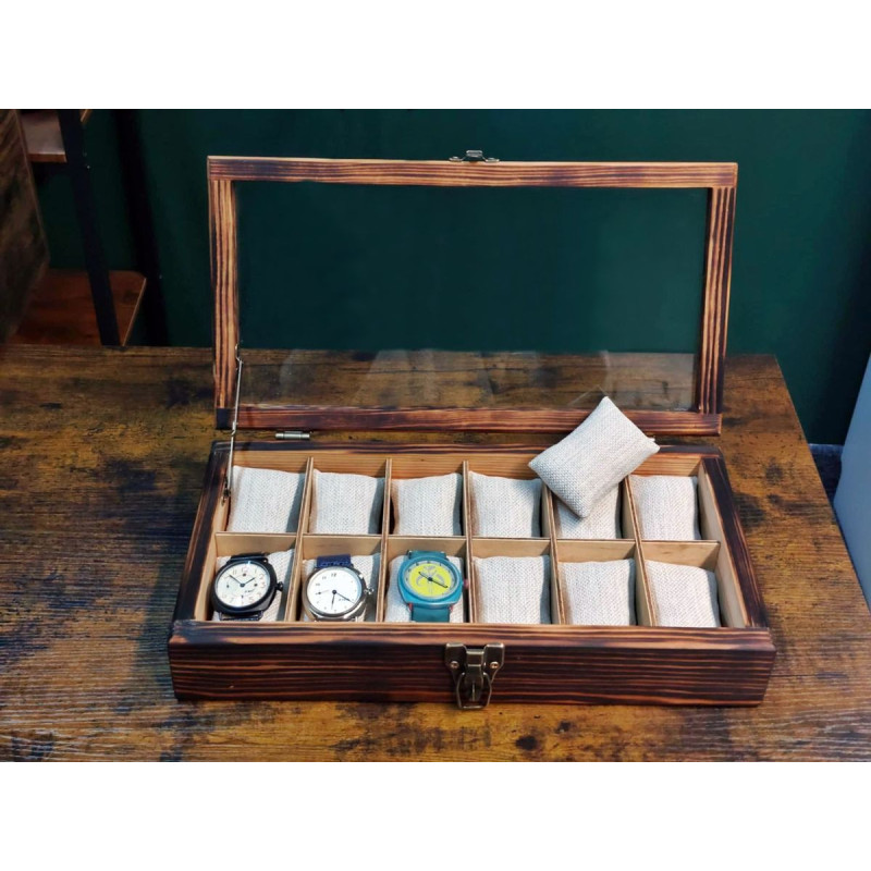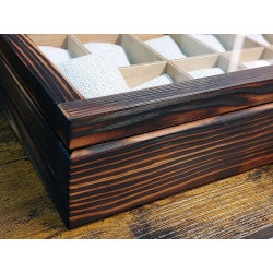 Wyjątkowo oryginalna i funkcjonalna, w całości ręcznie robiona, piękna skrzyneczka ze starego, długo sezonowanego drewna jodłowego do przechowywania 12 sztuk zegarków. Wykonanie z pełnego drewna, opalanego, dodatkowo postarzanego, szlifowanego, woskowanego woskiem przeznaczonym do konserwacji drewna. Dzięki temu skrzyneczka uzyskała głęboki kolor, została pięknie wyeksponowana faktura i kolory drewna jodłowego. Klamra jest wykonana z metalu w kolorze starego mosiądzu (podobnie zawiasy).