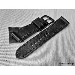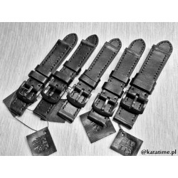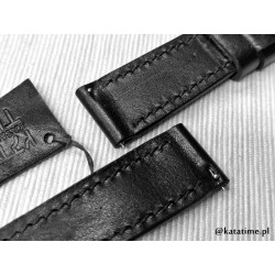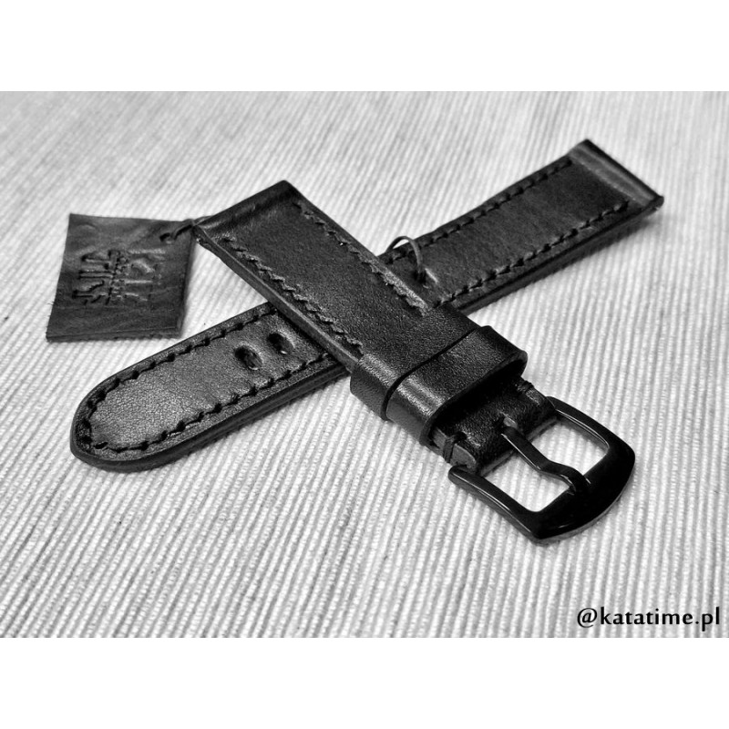 W całości robiony ręcznie pasek do zegarka. Naturalna skóra licowa w kolorze głębokiej jak sadza, półmatowej czerni, szycie nicią średnio grubą, w kolorze skóry. Obie części paska wykonane są z jednego kawałka skóry, klejonego i szytego na całej długości, dzięki czemu pasek będzie dłużej służył i wygodniej się nosił niż standardowe, seryjne, fabryczne paski, taki pasek posłuży lata. Boki szlifowane i lakierowane na czarno, w kolorze skóry.