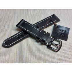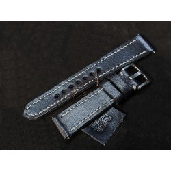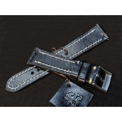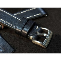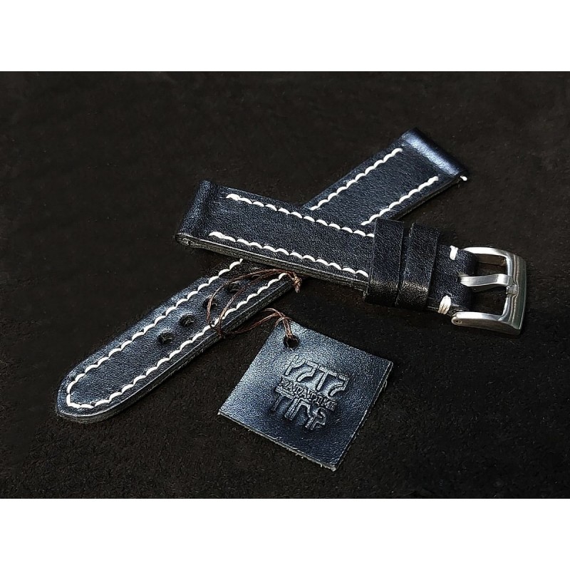 W całości robiony ręcznie pasek do zegarka. Naturalna skóra licowa w kolorze głębokiej jak sadza, półmatowej czerni, szycie nicią średnio grubą, w kolorze białym. Obie części paska wykonane są z jednego kawałka skóry, klejonego i szytego na całej długości, dzięki czemu pasek będzie dłużej służył i wygodniej się nosił niż standardowe, seryjne, fabryczne paski, taki pasek posłuży lata. Boki szlifowane i lakierowane na czarno, w kolorze skóry.