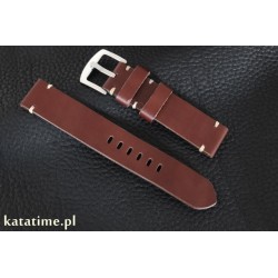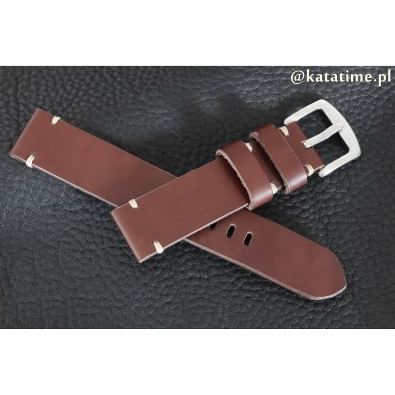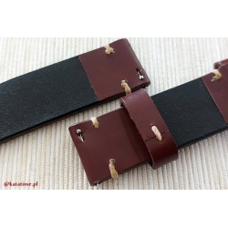 W całości robiony ręcznie pasek do zegarka. Naturalna skór w kolorze ciemnego, kasztanowego brzu, półmatowagładka, szycie nicią średnio grubą, w kolorze ecru. Spód paska jest wykonany z czarnej, naturalnej skóry licowej, dzięki czemu pasek będzie dłużej służył i wygodniej się nosił niż standardowe, seryjne paski, taki pasek posłuży lata. Boki szlifowane, surowe, dwukolorowe. Świetnie to wygląda.
