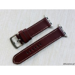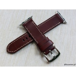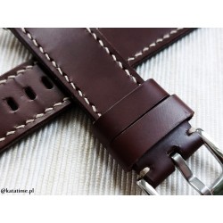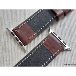 W całości robiony ręcznie pasek do zegarka. Naturalna, licowa skóra polska w kolorze kasztanowego brązu, matowa, gładka, szycie nicią średnio grubą, w kolorach białym. Spód paska jest wykonany z czarnej skóry lisowej, dzięki czemu pasek będzie dłużej służył i wygodniej się nosił niż standardowe, seryjne paski, taki pasek posłuży lata, właściwie jest nie do zdarcia lub zerwania, będzie się także długo i ładnie starzał. Boki szlifowane, lakierowane, dwukolorowe, brązowo-czarne. Super to wygląda.