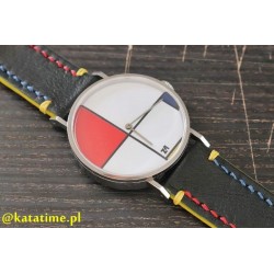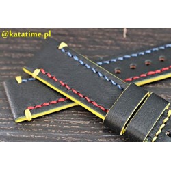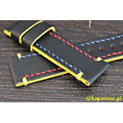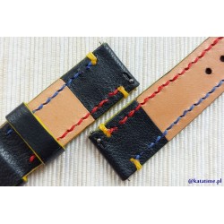 W całości robiony ręcznie pasek do zegarka. Naturalna skór w kolorze czarnym, półmatowa, gładka, szycie nicią średnio grubą, w kolorach Bauhausu (niebieski, czerwony i żółty). Spód paska jest wykonany z ciemnej, naturalnej skóry licowej, dzięki czemu pasek będzie dłużej służył i wygodniej się nosił niż standardowe, seryjne paski, taki pasek posłuży lata. Boki szlifowane, lakierowane w kolorze skóry.