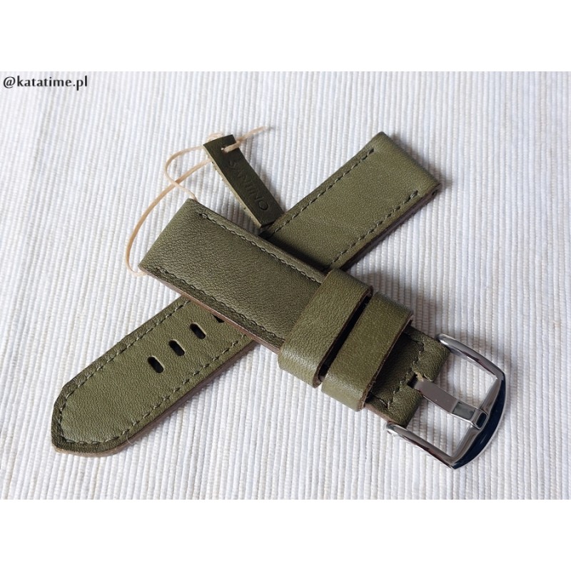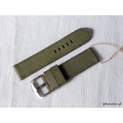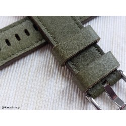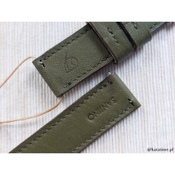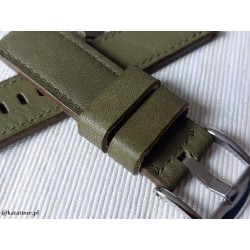 W całości robiony ręcznie pasek do zegarka. Naturalna, licowa skóra włoska w kolorze zgniłej zieleni - khaki - matowa, gładka, szycie nicią średnio grubą, w kolorze skóry. Pasek jest wykonany z jednego kawałka skóry, dzięki czemu pasek będzie dłużej służył i wygodniej się nosił niż standardowe, seryjne paski, taki pasek posłuży lata, właściwie jest nie do zdarcia lub zerwania. Boki szlifowane, surowe, dwukolorowe (zielone-czarne) – fajnie i oryginalnie to wygląda.
