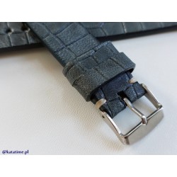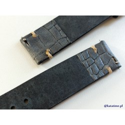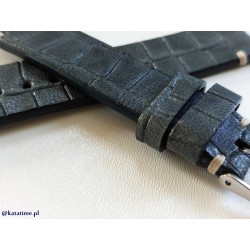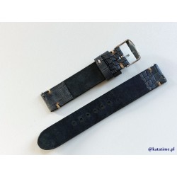 W całości robiony ręcznie pasek do zegarka. Naturalna skór w kolorze granatowo-niebiesko-szarym, półmatowa ze wzorem skóry krokodyla, szycie nicią średnio grubą, w kolorze ecru. Spód paska jest wykonany z ciemnej, naturalnej skóry licowej, dzięki czemu pasek będzie dłużej służył i wygodniej się nosił niż standardowe, seryjne paski, taki pasek posłuży lata. Boki szlifowane, lakierowane w kolorze skóry.