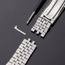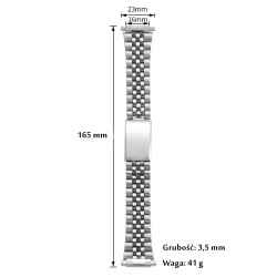 Solidna, uniwersalna, regulowana, stalowa bransoletka. Regulacja odbywa się przez odejmowanie ogniw i na klamrze. Ogniwa można później dołożyć z powrotem. Możliwość odpięcia większości ogniw. Samodzielne skrócenie bransoletki nie jest trudne.