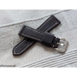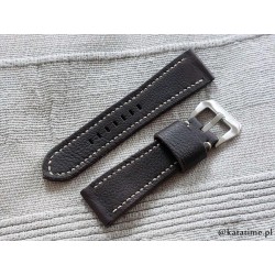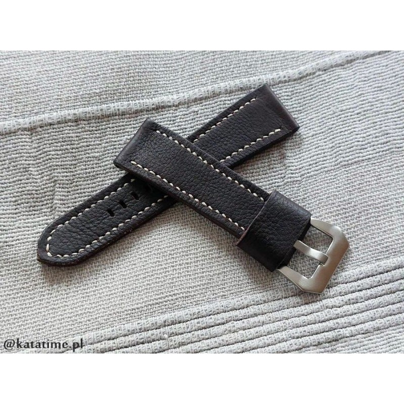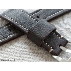 Pasek do zegarka, ręcznie robiony z jednego kawałka skóry. Naturalna skóra, wyprawiona roślinnie, ciemnobrązowa, matowa, z delikatną fakturą i na dodatek po obu stronach. Pasek stebnowany średnio grubą nicią w kolorze ecru (jasny beż). Boki lakierowane w kolorze skóry. Pasek jest miękki i elastyczny, świetnie będzie się układał na nadgarstku już od pierwszego założenia.