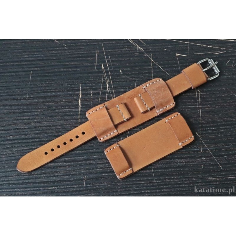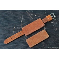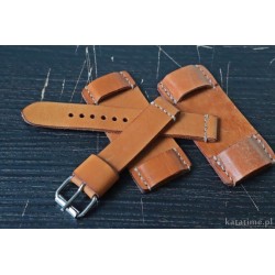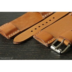 W całości robiony ręcznie pasek do zegarka. Naturalna skóra juchtowa, stara, ale przygotowana do szycia pasków, półmatowa, gładka), szycie nicią średnio grubą, w kolorze ecru. Boki gładkie, szlifowane, surowe.