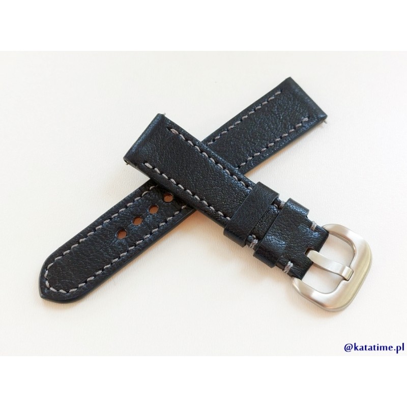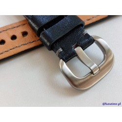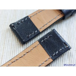 W całości robiony ręcznie pasek do zegarka. Naturalna, licowa skóra polska w kolorze bardzo ciemnego granatu, matowa, gładka, szycie nicią średnio grubą, w kolorach, niebieskim i białym. Pasek jest wykonany z jednego kawałka skóry, dzięki czemu pasek będzie dłużej służył i wygodniej się nosił niż standardowe, seryjne paski, taki pasek posłuży lata, właściwie jest nie do zdarcia lub zerwania, będzie się długo i ładnie starzał. Boki szlifowane, lakierowane w kolorze skóry.