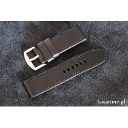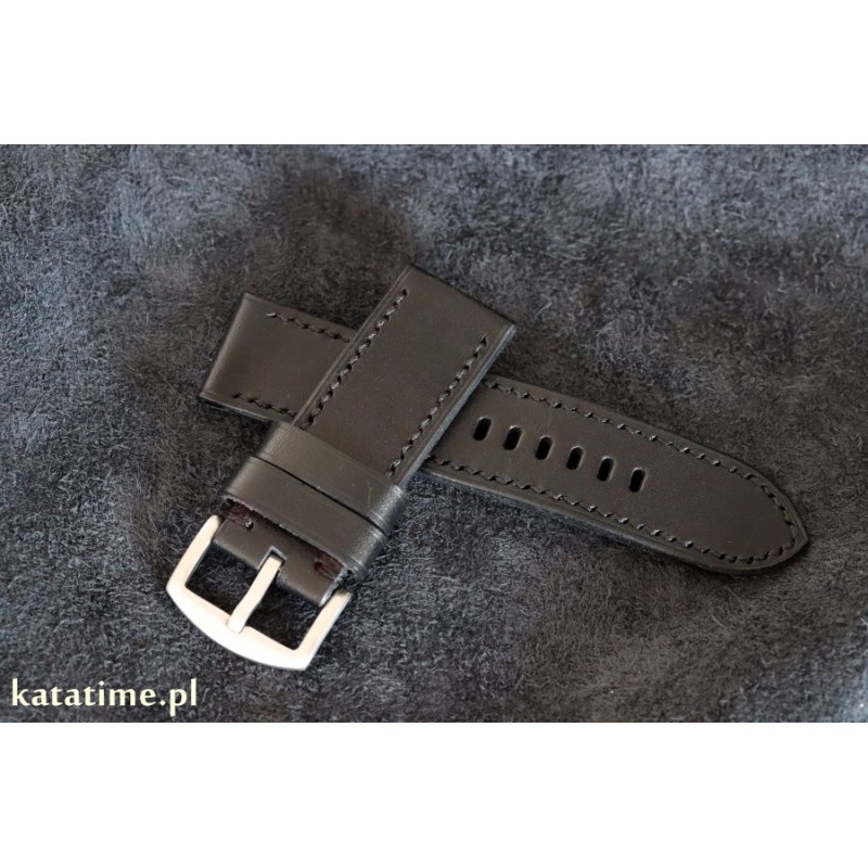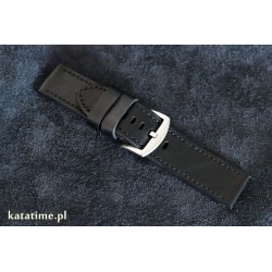 Ręcznie robiony pasek do zegarka. Naturalna skóra, czarna jak noc listopadowa, z delikatnym połyskiem i na dodatek po obu stronach. Pasek stebnowany średnio grubą nicią w kolorze skóry. Boki lakierowane, czarne. Świetna jakość wykonania. Produkt jednego z najlepszych, polskich rymarzy-kaletników.