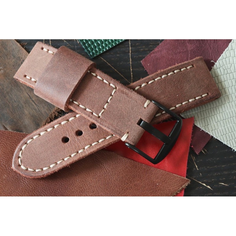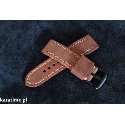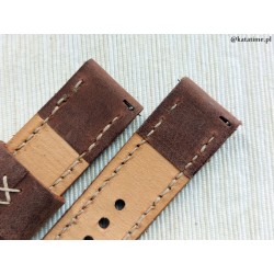 W całości robiony ręcznie pasek do zegarka. Naturalna, nubukowa skóra włoska w kolorze brązowym, matowa, gładka, szycie nicią średnio grubą, w kolorze jasnobeżowym (ecru). Spód paska jest wykonany z jasnej, naturalnej skóry juchtowej, dzięki czemu pasek będzie dłużej służył i wygodniej się nosił niż standardowe, seryjne paski, taki pasek posłuży lata. Boki szlifowane, surowe, dwukolorowe w kolorze obu skór – fajnie i oryginalnie to wygląda.