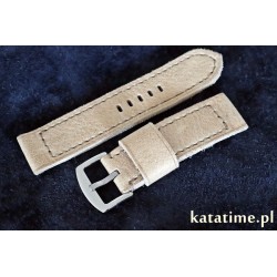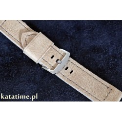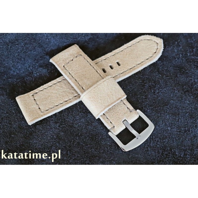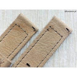 W całości ręcznie robiony, rzadkiej urody pasek do zegarka. Naturalna skóra, z wykończeniem licowym, matowym, minimalnie cieniowana, w kolorze beżowym, przeszywany nicią w kolorze skóry. Spód wykonany z tej samej skóry. Boki surowe, szlifowane. Pasek jest miękki, będzie się dobrze układał od razu po założeniu.