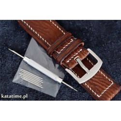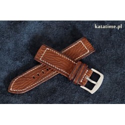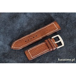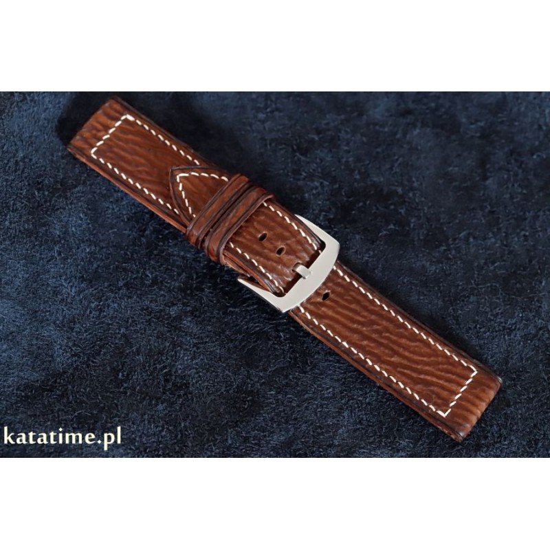 Ręcznie robiony pasek do zegarka. Naturalna, nowa skóra z rekina, brązowa, cieniowana, matowa. Pasek stebnowany nicią w kolorze białym. Boki lakierowane w kolorze skóry. Pasek będzie się bardzo ładnie i ciekawie starzał.