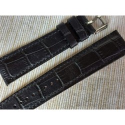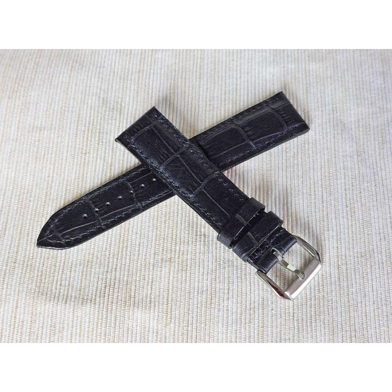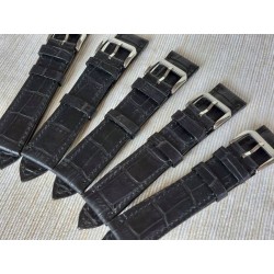 W całości robiony ręcznie pasek do zegarka. Naturalna skór w kolorze ciemnografitowym/czarnym, matowa, ze wzorem skóry aligatora, szycie nicią w kolorze skóry. Pasek pogrubiony (tzw. poduszka). Spód paska jest wykonany z jasnej, naturalnej skóry juchtowej, dzięki czemu pasek będzie dłużej służył i wygodniej się nosił niż standardowe, seryjne paski, taki pasek posłuży lata. Boki szlifowane, lakierowane w kolorze skóry.