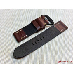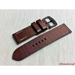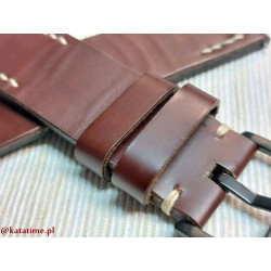 W całości robiony ręcznie pasek do zegarka. Naturalna, matowa skóra licowa w kolorze ciemnobrązowym (kasztanowym), gładka, szycie nicią średnio grubą, w kolorze ecru (beżowym). Spód paska wykonany jest z czarnej, naturalnej skóry. Klamerka stalowa, w kolorze czarnym, ze szczotkowanym (matowym) wykończeniem.