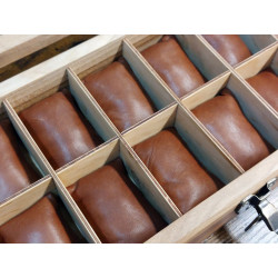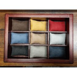 Poduszeczki są wykonane z mocnego, wytrzymałego materiału obiciowego o podwyższonej odporności na zabrudzenia i rozdarcia, w grubą fakturą naturalnego płótna lnianego lub alcantary. W skrzyneczce standardowo są poduszki z tkaminy w kolorze brązowym, ale mogą być także w innych kolorach. Na zdjęciach są też pokazane poduszki z naturalnej, koziej skóry, te poduszki są za dostępne także, ale za dopłatą.