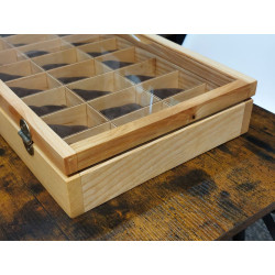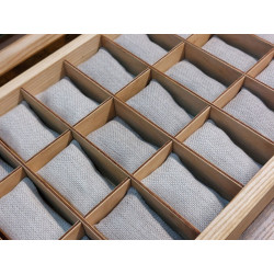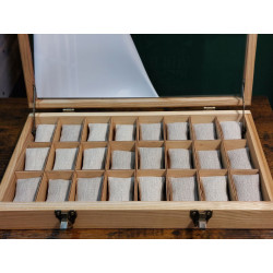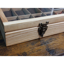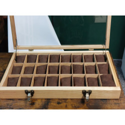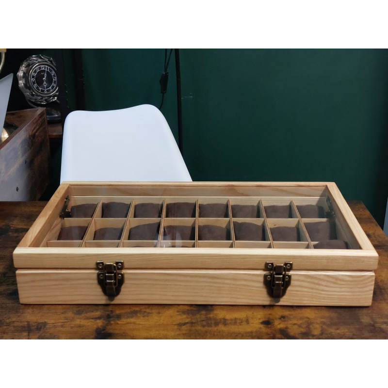 Elegancka i funkcjonalna, w całości ręcznie robiona, piękna skrzyneczka z pełnego drewna jesionu polnego, ponad 100-letniego, do przechowywania 24 sztuk zegarków. Wykonanie z pełnego drewna, szlifowanego i olejowanego* naturalnym olejem lnianym. Olej tworzy dodatkową warstwę ochronną na powierzchni drewna, chroniąc je przed wilgocią, plamami i drobnymi uszkodzeniami mechanicznymi. Olejowanie uwydatnia kolor i naturalną strukturę włókien drewna, podkreśla jego naturalne piękno. Powierzchnia zupełnie matowa, z wyraźnie zarysowaymi słojami drewna. Kolor naturalnego jasnego, pięknie wybarwionego, starego drewna jesionu polnego. Całość utrzynama w rystykalnym, dość surowym stylu, ale z dbałością o każdy szczegół wykonania.