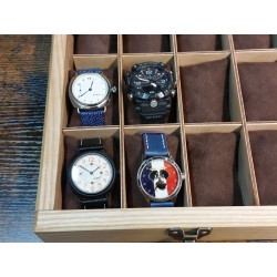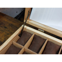 Ta skrzyneczka posłuży lata. Solidne zawiasy i zapięcie idealnie pasują do rustykalnego stylu całości. Kieszonki na zegarki są duże i głębokie, świetnie zabezpieczają zegarki przed uszkodzeniem oraz porysowaniem przez np. koronkę sąsiada, wygodnie zmieszczą się zegarki o szerokości nawet 55 mm! Szkło w wieczku skrzyneczki jest grube dzięki czemu ma podniesioną odporność na stłuczenia. Warto popatrzeć na szczegóły wykonania. Pudełko jest podklejone filcem dzięki czemu nie będzie rydowało powierzchni na któej będzie stało.