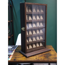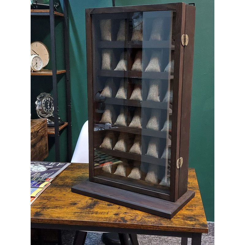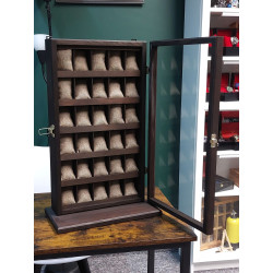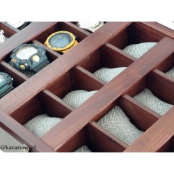 Elegancka i funkcjonalna, w całości ręcznie robiona, piękna witryna ze starego, długo sezonowanego drewna jodłowego do przechowywania i bezpiecznego przewożenia 30 zegarków. Wykonana jest z pełnego drewna, szlifowanego, bejcowana i woskowana naturalnym woskiem pszczelim. Ta skrzyneczka posłuży lata. Solidne zawiasy i zapięcie idealnie pasują do rustykalnego stylu całości. Kieszonki na zegarki są duże i głębokie, świetnie zabezpieczają zegarki przed uszkodzeniem oraz porysowaniem przez np. koronkę sąsiada, wygodnie zmieszczą się zegarki o szerokości nawet 55 mm! Szkło w drzwiczkach jest grube, hartowane dzięki czemu ma podniesioną odporność na stłuczenia i porysowanie. Warto popatrzeć na szczegóły wykonania. Dopracowany został system wsadzania i przechowywania zegarków. Dzięki poziomym, podwójnym i poszerzonym przegródkom zegarki odpoczywają bezpiecznie, bez możliwości wypadnięcia. Dodatkowe listewki zabezpieczają także zegarki podczas transportu. Szeroka podstawka daje stabilność całości, jest podklejona gumowymi podkładkami. Podstawa jest przykręcana, dzięki czemu witryna może być położona i zegarki można przechowywać w pozycji poziomej.