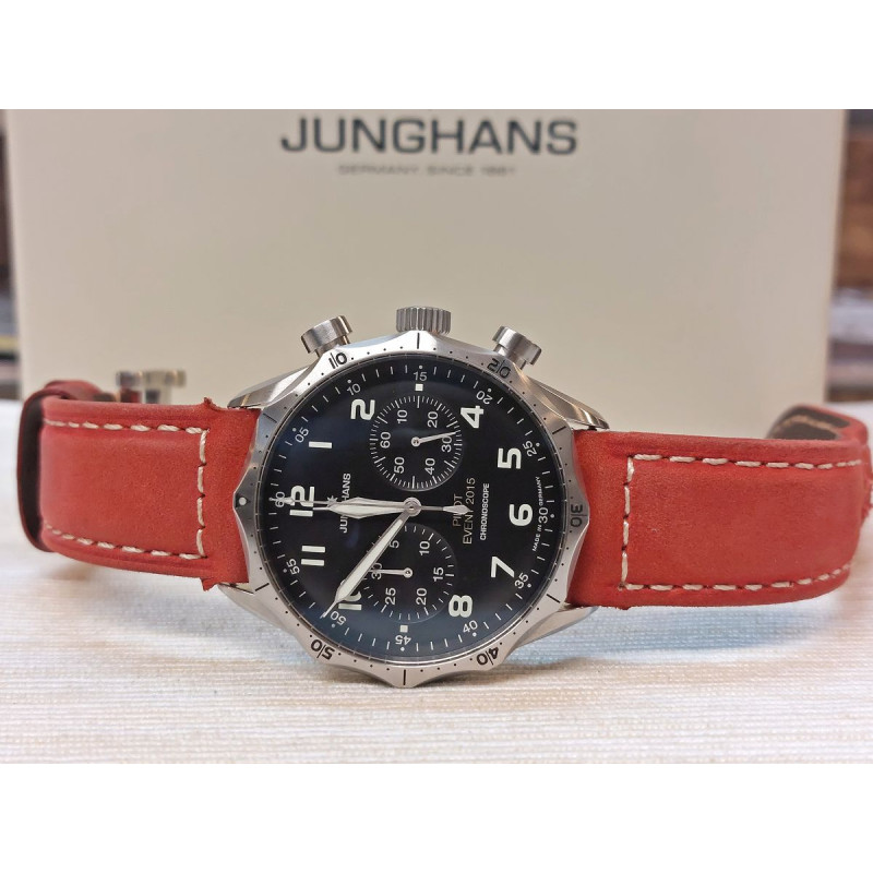 Limitowana edycjaMeister Pilot sięga po charakterystyczne elementy kształtu legendarnego zegarka dla pilotów Junghans z lat 40/50-tych ubiegłego wieku i łączy je ze stylową formą obecnej linii Meister. Elegancki sznyt obudowy, jak również płynne kształty narożników skupiają konsekwentnie uwagę pilotów na dużej tarczy. Obustronnie wygięte szkło szafirowe oferuje najlepszy widok na wyraźne świecące cyfry i wyraziste wskazówki. Również przy złych warunkach oświetleniowych i w nocy zegarek umożliwia pełną orientację. Na samej tarczy znajdują się chronoskopy Bicompax, których dwa totalizatory są umieszczone na osi 3-9. 12 charakterystycznych nacięć w formie soczewki na obustronnie obrotowej lunecie gwarantują dobry chwyt i tworzą jedyny w swoim rodzaju wygląd zegarka, który przypomina swojego historycznego przodka. Dla rozmiłowanych w szczegółach gości biorących udział w podniosłym wydarzeniu, na siedmiokrotnie przykręcanym, kopułowym dekielku umieszczona została grafika zabytkowego tarasowego budynku - z perspektywy, z jakiej mogą go podziwiać tylko piloci. Specjalna zasada konstrukcji montażu z przodu zapewnia zegarkowi nadzwyczajną, jak na zegarek dla pilota, elegancję oraz lekkość niezbędną do startu.