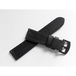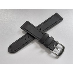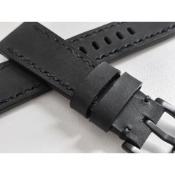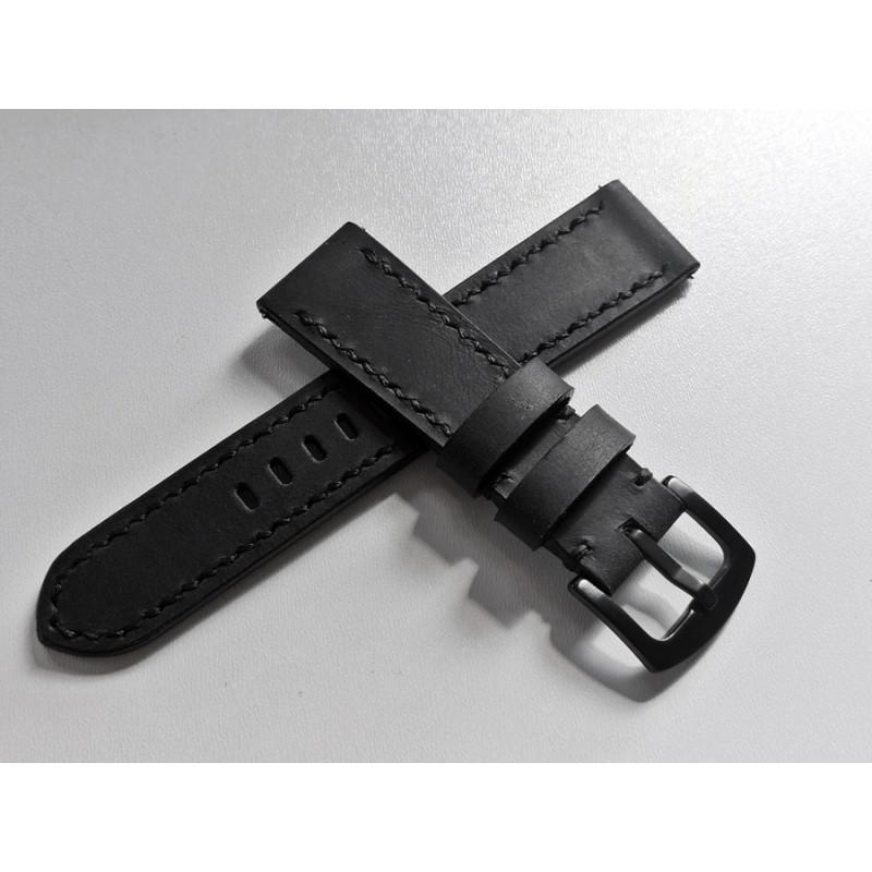 W całości robiony ręcznie pasek do zegarka. Naturalna skóra licowa w kolorze głębokiej jak sadza, matowej czerni, szycie nicią średnio grubą, w kolorze skóry. Obie części paska wykonane są z jednego kawałka skóry, klejonego i szytego na całej długości, dzięki czemu pasek będzie dłużej służył i wygodniej się nosił niż standardowe, seryjne, fabryczne paski, taki pasek posłuży lata. Boki szlifowane i lakierowane na czarno, w kolorze skóry.
