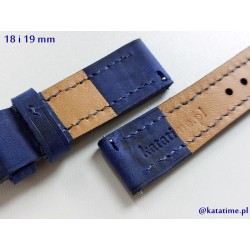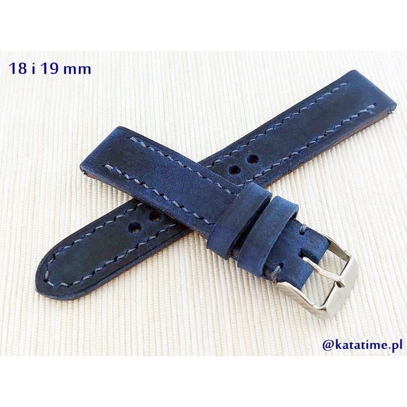 W całości robiony ręcznie pasek do zegarka. Naturalna skór w kolorze głębokiego granatu, matowa z wykończeniem nubukowym, szycie nicią średnio grubą, w kolorze skóry. Spód paska jest wykonany z jasnej, naturalnej skóry licowej, dzięki czemu pasek będzie dłużej służył i wygodniej się nosił niż standardowe, seryjne paski, taki pasek posłuży lata. Boki szlifowane, surowe, dwukolorowe, granatowo-brązowe – super to wygląda na żywo.